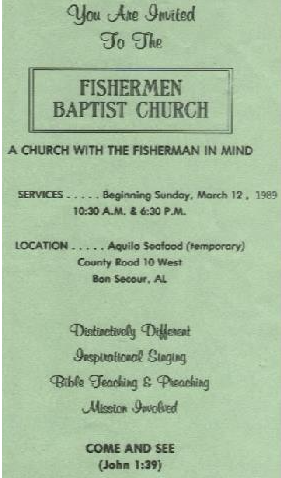 Fishermen Baptist Church started in March 1989 under Founder/Pastor Wayne Mund at the facilities of Aquila Seafood in Bon Secour, Alabama (see the first Sunday invite below). Soon the church purchased a vacated net shop on the banks of the Bon Secour River and converted into a church building. Fitting as once a place of mending nets, God brought forth a work of mending lives.